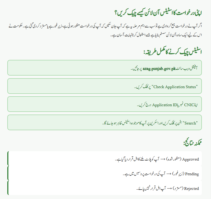 You can visit the official portal azag.punjab.gov.pk, enter your CNIC or Application ID, and click “Check Status” to instantly view your result.