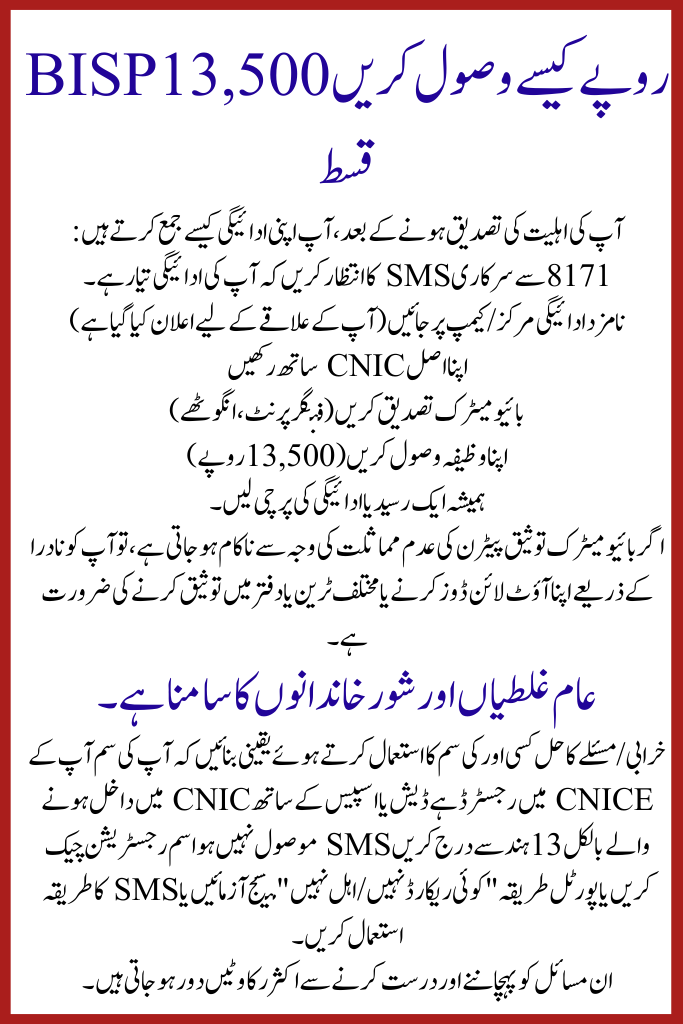 Ensure your SIM is recorded with your CNIC. Or try the doorway method. If glitches persist, visit a BISP office.