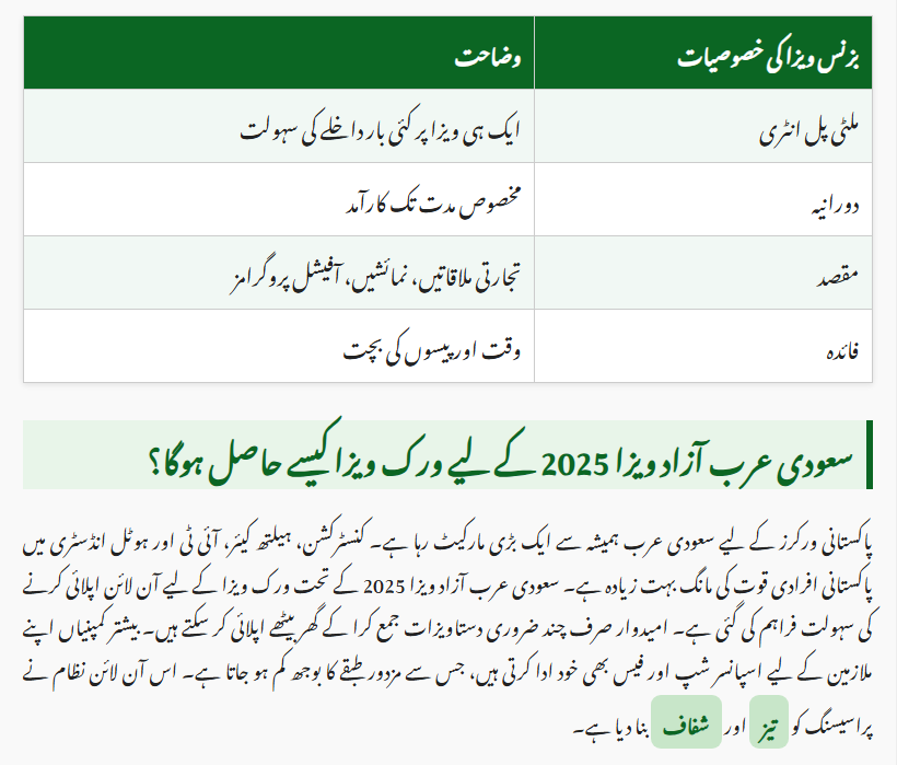 For Pakistani entrepreneurs and traders, the Saudi government has introduced a Business Visa (Multiple Entry). This visa allows businessmen to travel to Saudi Arabia multiple times within a set period, saving both time and money. With this visa, Pakistani businessmen can attend trade exhibitions, meetings, and official events without applying again and again. This not only strengthens individual businesses but also improves trade relations between Pakistan and Saudi Arabia.